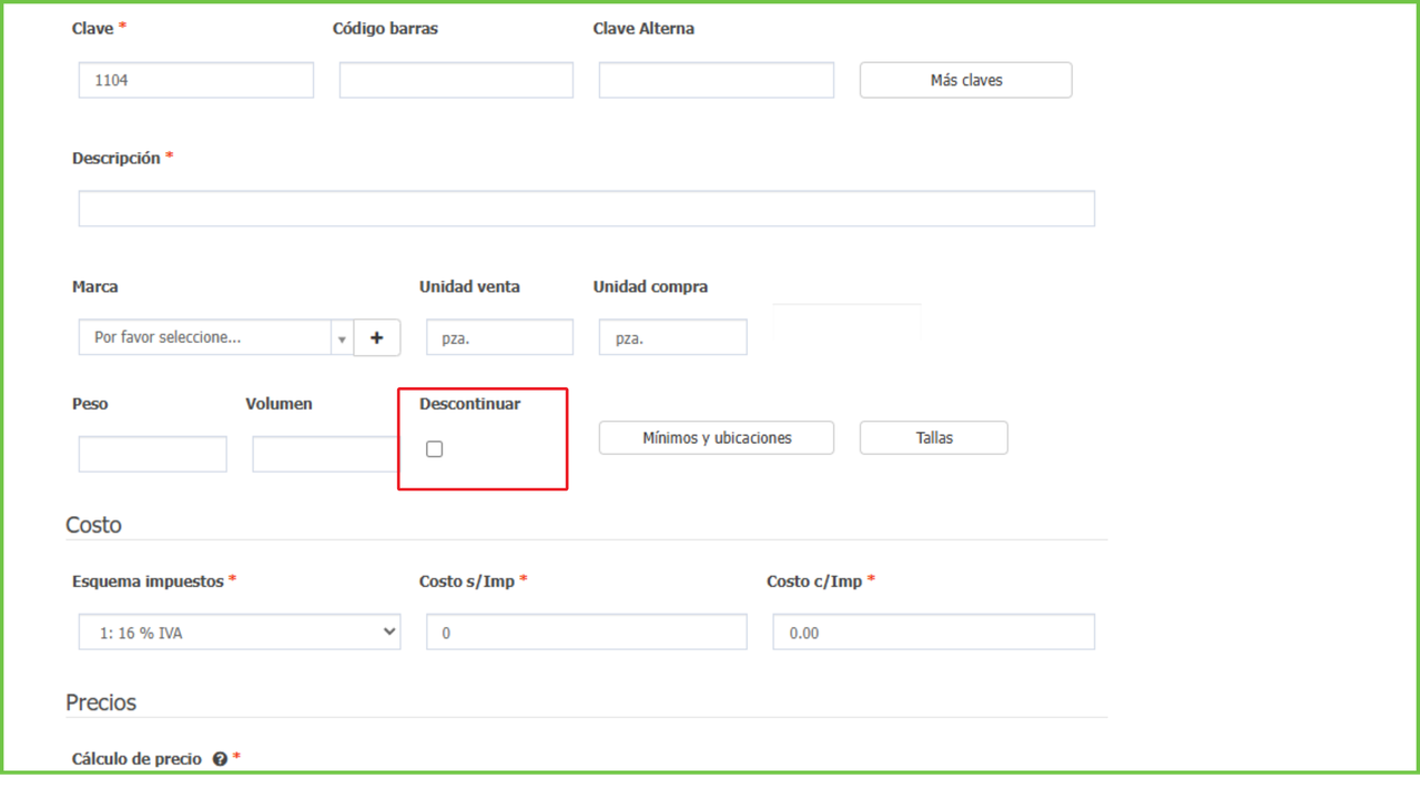 - Tienda: Indica si el producto será visible en la tienda en línea. (Este campo solo es visible si tienes contratado el ecommerce de Pvnube).