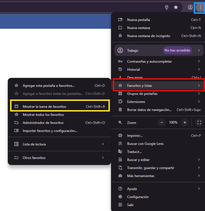 - Selecciona Favoritos y listas → Mostrar barra de favoritos o usa el atajo Ctrl + Shift + B.