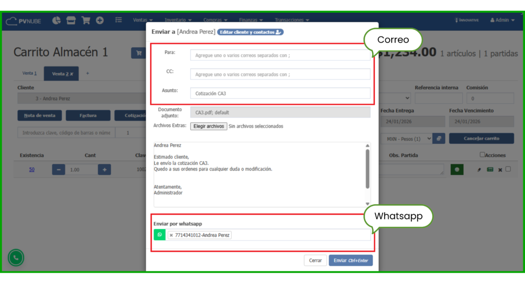 Una vez generada, la cotización puede enviarse directamente desde Pvnube:
