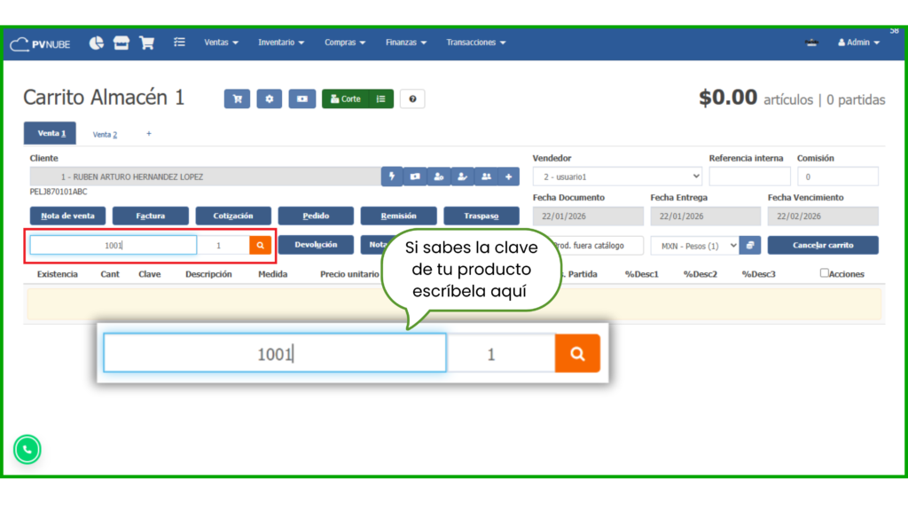 El proceso inicia ingresando al carrito de ventas mediante el botón correspondiente en el sistema. Este espacio funciona como el área de trabajo donde se selecciona el cliente y se agregan los artículos que formarán parte de la cotización.