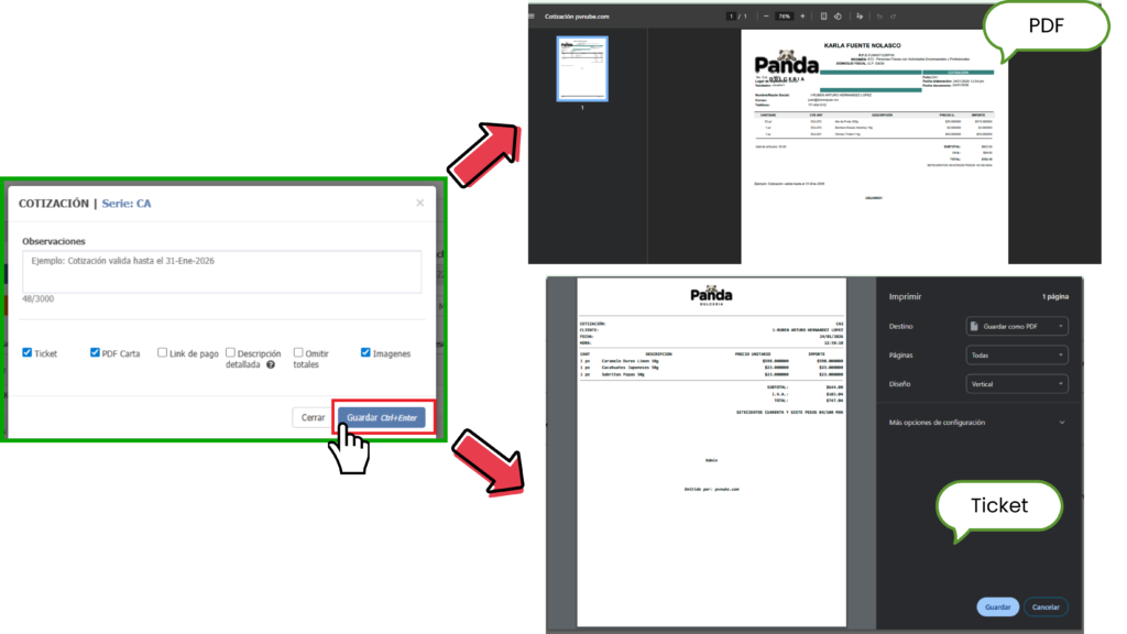 Al confirmar la información, selecciona Guardar. El sistema generará automáticamente la cotización en el formato elegido.
