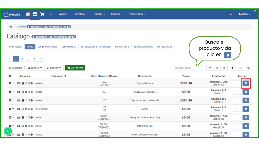 Mediante el botón de catálogo, visualiza todos los productos disponibles y agrégalos directamente.