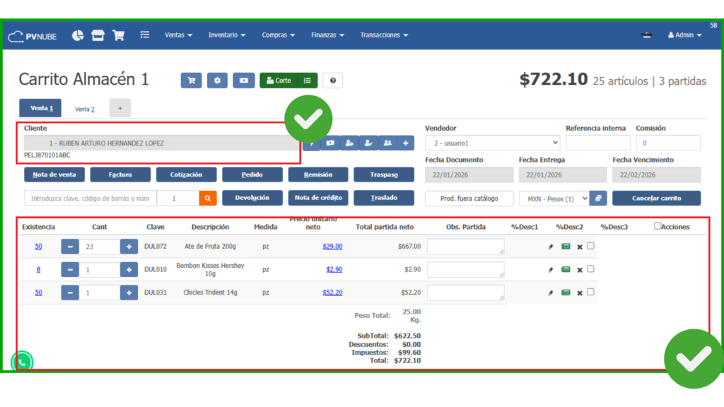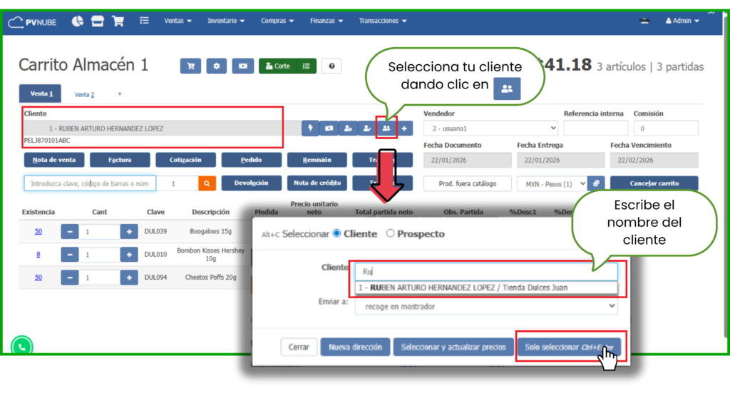 Una vez cargado, el sistema asocia automáticamente la cotización a ese cliente, asegurando que el documento incluya correctamente sus datos.