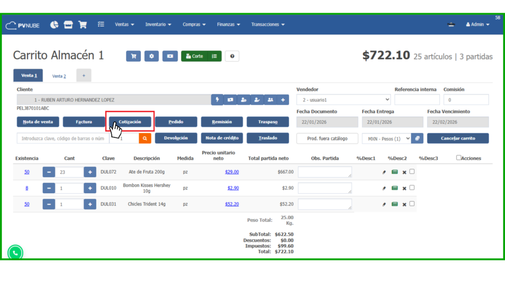 En el sistema de punto de venta, las cotizaciones se generan directamente desde el carrito de ventas, permitiendo trabajar con clientes registrados, artículos del catálogo y distintos formatos de presentación.