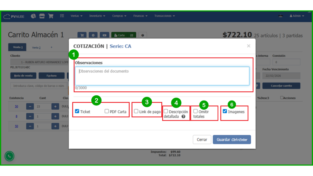 Una vez validada la información, presiona el botón “Cotización”. En esta sección se configuran los detalles finales del documento.