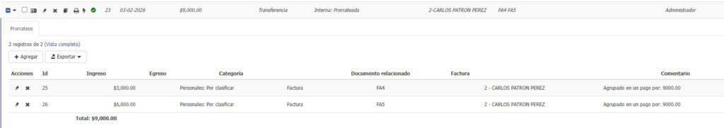 - Cada movimiento hijo indica que proviene del prorrateo del ID de la transacción padre.