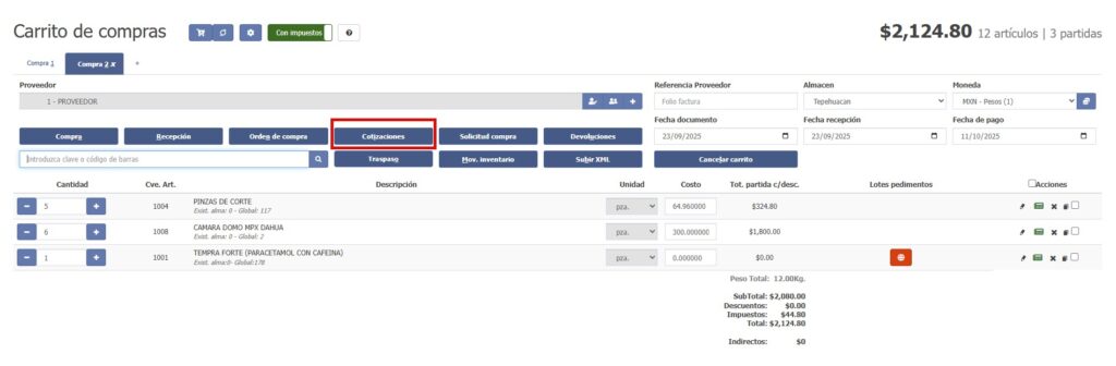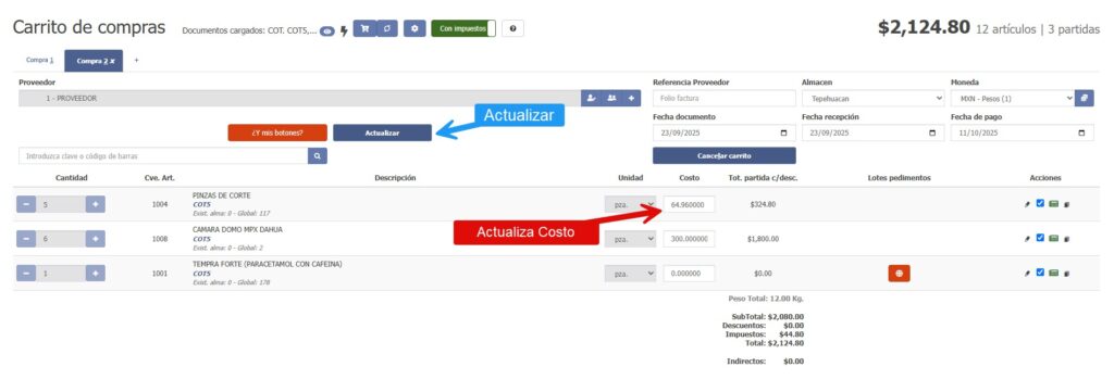 De esta forma, se cargará el carrito con los artículos y podrás actualizar el costo según la respuesta de tu proveedor. Una vez modificado, presiona Actualizar y luego Avanzar para generar tu orden de compra.