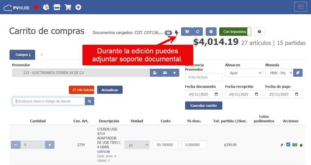Adjuntar la cotización que tu proveedor te envió