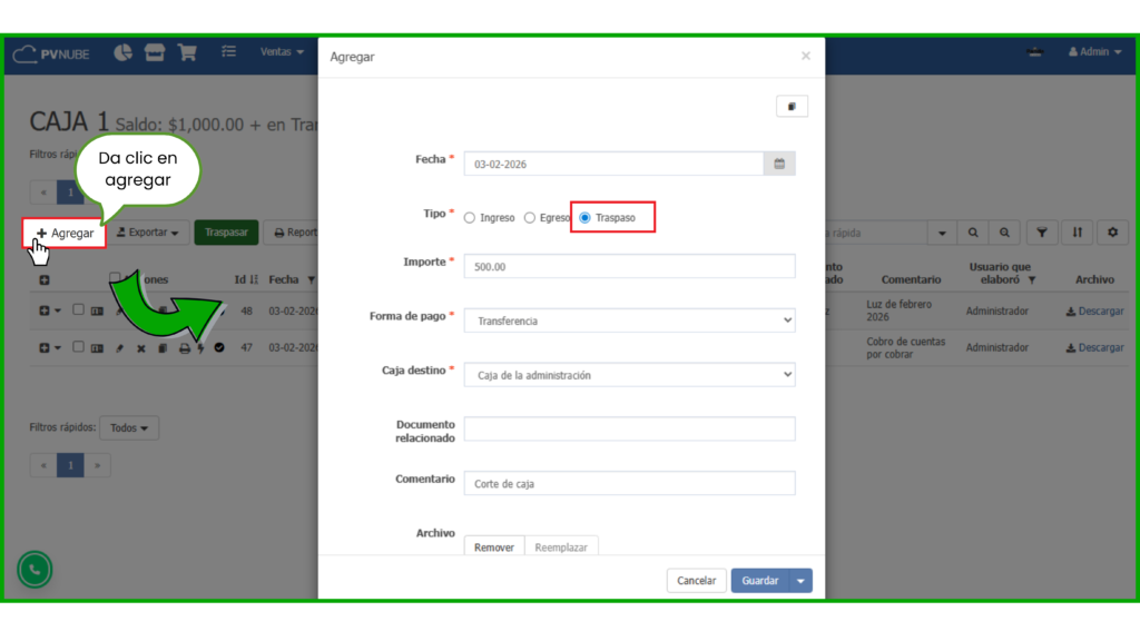 - Paso 2: Seleccionar la opción Agregar → Traspaso.