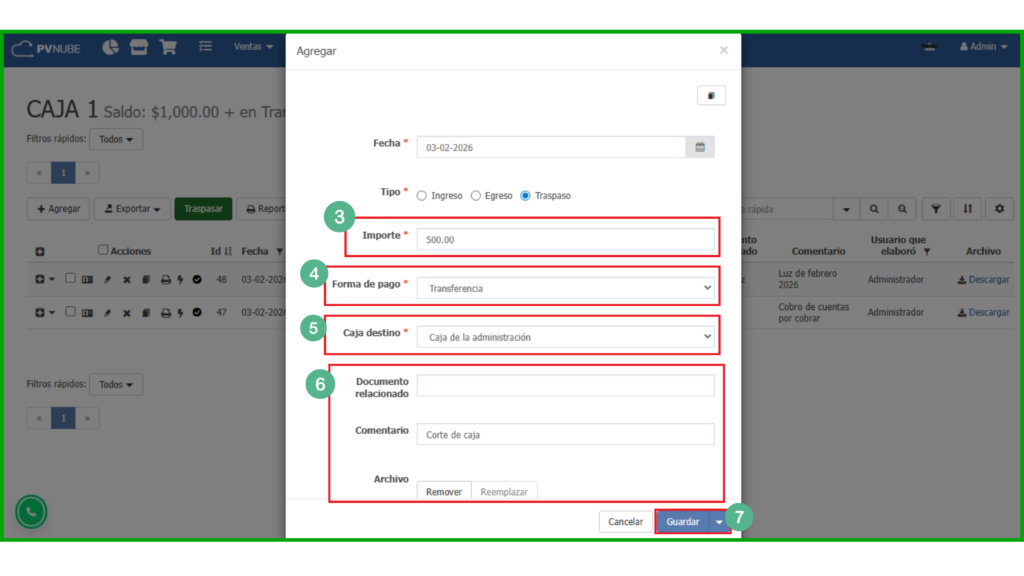 Los traspasos de dinero son movimientos internos que permiten transferir una cantidad de efectivo u otro medio de pago de una caja a otra, sin que esto represente un ingreso o gasto externo para la empresa.