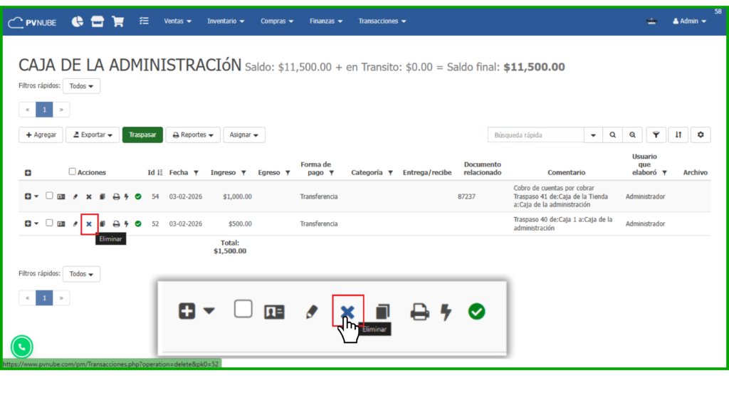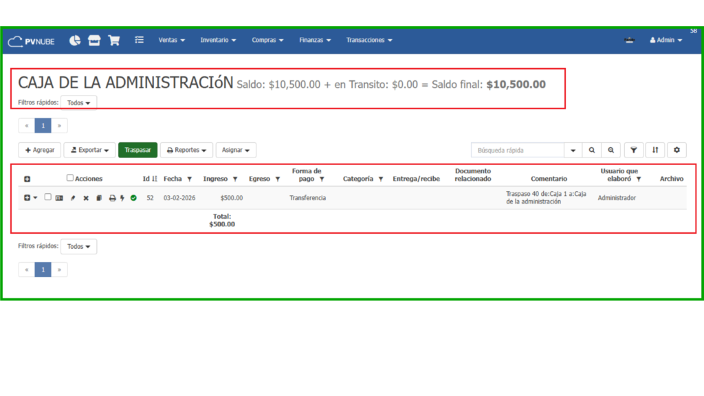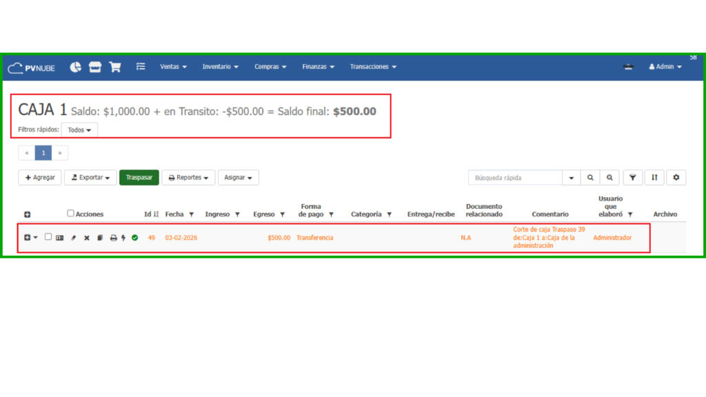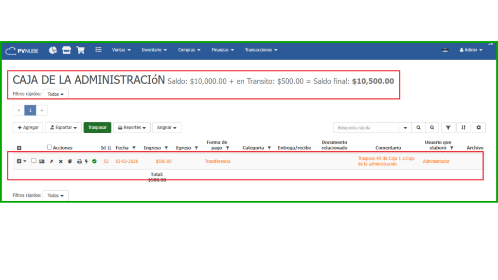 - En Tránsito: Es el dinero que está traspasandose a/desde otras cajas y que aún no ha sido validado.