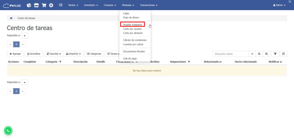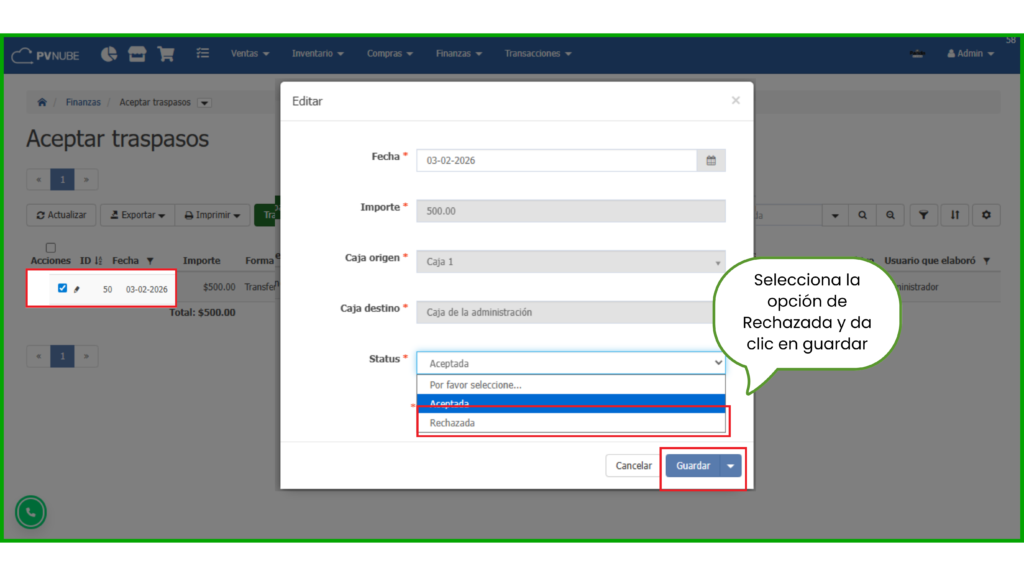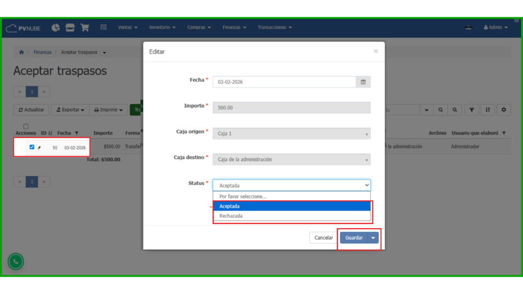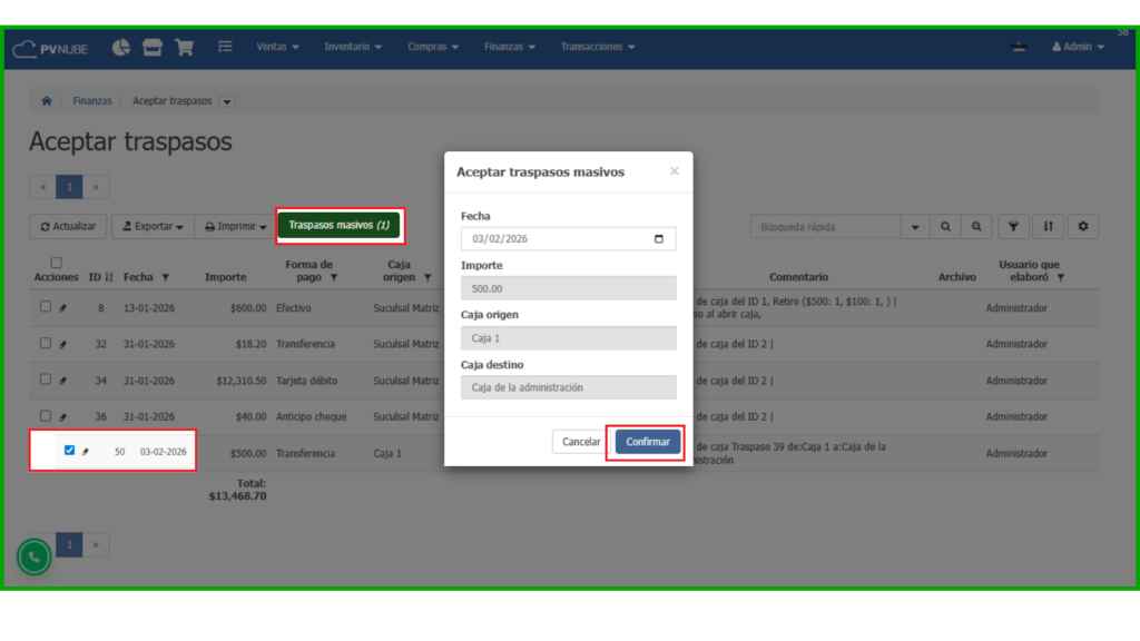 El traspaso debe ser aceptado por el usuario que tenga permisos sobre la caja destino.